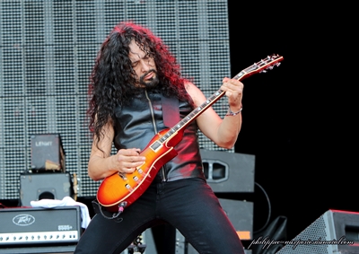 Je ne peux voir que la deuxième moitié du set de Five Finger Death Punch à cause de mon interview avec Godsmack, et surtout de l’inversion de Lamb Of God et 5FDP que je n’avais pas prévue. J’enrage, car tout ce que je vois me plaît. Ivan, l'imposant le chanteur, est très à l’aise et le groupe a un super son. Quand j’arrive, Ivan est en train de faire chanter au public « burn motherfucker, burn » (ça au moins, c’est simple et on y arrive très bien). Le bassiste a une barbe de dingue qui se termine en dreadlocks. Les deux guitaristes balancent des médiators sans arrêt dans la foule. Le batteur a un déguisement de squelette avec un truc qui lui éclaire dans la bouche, ça fait un drôle d’effet. Comme souvent avec les groupes américains, les fuck, fucking et autres variantes pleuvent. Ils jouent les meilleurs morceaux de leur excellent dernier double album, je suis aux anges. Ils font un rappel et demandent à tout le monde d’allumer les portables, puis ils demandent à l’orga de tout éteindre ; l’effet est très chouette. Ils quittent la scène sur un surprenant The House Of The Rising Sun. Leur set est très puissant, j’ai vraiment aimé le peu que j’en ai vu. Gros regrets pour le reste. On comprend mieux qu'ils tournent actuellement en première partie de Judas Priest, c'est mérité.