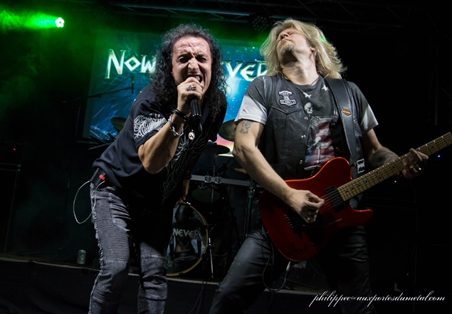 Après une courte intro fraîchement composée pour l'occasion, Now Or Never entre sur scène. Debout derrière sa batterie, Ranzo salue le public, le reste du groupe le suit puis entame le set avec Sonic Extasy puis I Shall Remain, deux brûlots extraits du nouvel album II sorti quelques jours avant. S'ensuit Reach Out For The Sky : sur le riff d'intro, Ricky joue au méchant et cela lui va bien. Même si le son n'est pas toujours au rendez-vous, Jo assure sur ce titre. Il est dommage que, collé à la scène, on ne puisse pas mieux l'entendre et que l'on soit obligé d'être au milieu de salle pour faire le constat de son talent !... Allez, on continue. Cela sent bon le Heavy Metal sur le brûlot éponyme Now Or Never, les cinq vétérans sont en mode warrior ! Si Jo Amore est un superbe chanteur, Ricky Marx est, lui, un sacré soliste.