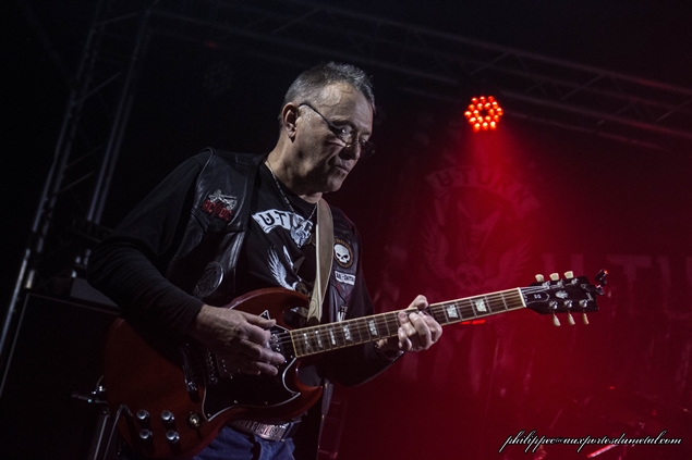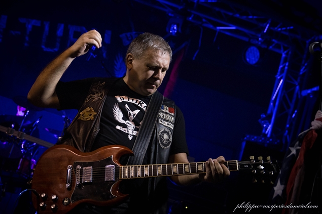 Vers 21h30, U-Turn monte sur scène. Ce groupe est formé de cinq musiciens : Max Sidney-Chant, Yves Martin-Basse, Daniel Moge-Guitare, Frédéric Accaries-Guitare et Frédéric Leullier- Batterie. Le quintet se présente en mode biker, tous vêtus de gilets en cuir avec au dos le logo du groupe, et va nous jouer une musique oscillant entre Hard Rock, Rock Sudiste, Country... Un mix assez fun ! Et cela se ressent sur scène, tout ce beau monde prend du plaisir et les potes venus les voir aussi.