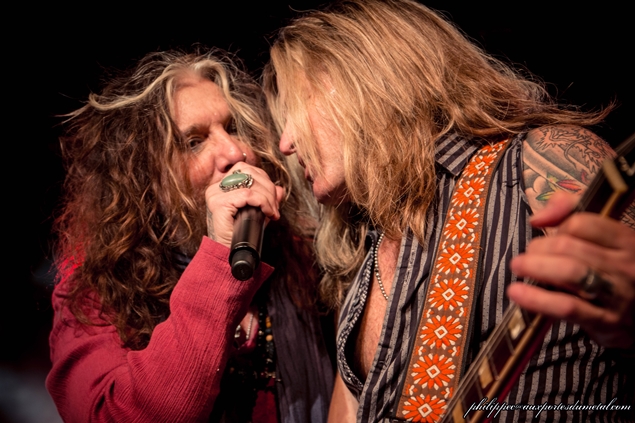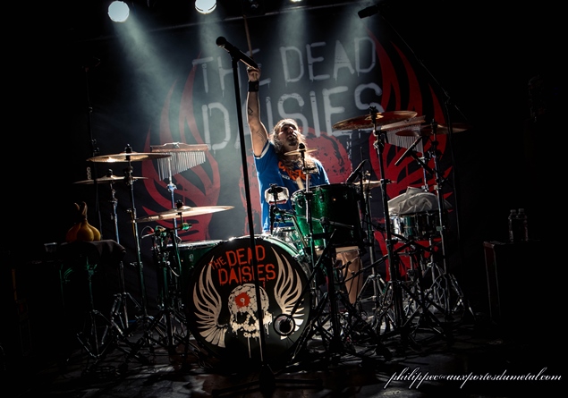 Enfin au chant, avec des petits airs de Steven Tyler, c’est aujourd’hui John Corabi, qui a remplacé Jon Stevens. John est connu pour avoir entre autres remplacé Vince Neil dans Mötley Crüe, ou encore pour avoir été guitariste au sein de Ratt. Le son de The Dead Daisies est bien plus fort que pour The Answer, c’est dommage, mais tout est toujours "plus" avec nos amis américains. Ils sont tout sourires, et attaquent fort avec Long Way To Go, un extrait de leur troisième et dernier album. La voix de John est bien en place, mais il a des soucis avec les in-ear monitors, ses écouteurs cachés sous son épaisse tignasse qui lui donnent les retours. Il passera la soirée à essayer de résoudre le problème, en vain. Je disais qu’avec sa chevelure et ses mèches blanches à la Cruella, il avait des airs de Steven Tyler, mais ses acolytes en joue aussi, car ils attaquent l’intro de Sweet Emotion, en se foutant de lui.