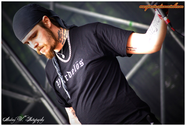 Prend place sur la Mainstage Death Angel. Les ayant vu dans un autre festival en 2008, leur présence me fait grand plaisir. Le chanteur bouge tout du long de la scène, headbanguant à l'unisson, ses longues dread virevoltant dans tous les sens. Les titres défilent, ils sont toujours aussi mordants, pas trop violents, juste ce qu'il faut pour faire bouger la foule. Le temps d'aller chercher à manger, le temps nuageux se transforme en pluie et ça ne changera pas jusqu'au lendemain dans l'après midi. Je vais donc enfiler à mon appareil photo son manteau de pluie et le mien par la même occasion. Vient ensuite Sepultura. Groupe culte de la scène metal, il était important pour moi de prendre quelques clichés et de jeter une oreille à leur musique. Qu'il est rare de voir dans le milieu du metal une personne de couleur, de plus imposer sa musique et d'en faire un mythe surtout avec leur cultisme "Roots Bloody Roots" chanté en cœur par tout un chacun. Malgré la pluie (ce qui n'arrête pas le metalleux), une foule importante se tient dans la fosse. De loin le son est vraiment bon car il est bien audible depuis les grandes tonnelles installées pour l'occasion, où se trouve un grand bar avec table et banc pour se reposer les jambes et ainsi profiter des concerts. Six Feet Under prend possession de la grande scène. Groupe largement connu de tous, il m'est sympathique de les voir enfin ! Encore un dreadeux me direz vous. C'était effectivement leur journée et même leur festival car ce ne seront pas les derniers a défiler sur les scènes du Metalfest. A mon grand regret, pas de reprise du titre d' AC/DC, TNT, car c'est la seule chanson que je connaisse (il faudrait peut-être que j'écoute un peu plus leur musique ?). Voici le tour d'un de mes groupes de Black/Death favoris, j'ai nommé les polonais de Behemoth. Installé sur la grande scène, pied de micro, maquillage, ambiance assez sombre qui reflète bien le groupe, les principaux titres sont joués, Conquer All, Decade Of Therion, bref que du bon. Nergal et ses sbires livrent une prestation impeccable, carrée et brutale. Toujours un plaisir de les voir en live. Alestorm, groupe connu pour son Metal de Pirate, change un peu du Folk ou du Pagan. J' avoue ne pas être fan de la voix du chanteur que je trouve un peu trop grave à mon goût, pourtant leurs mélodies sont accrocheuses. C'est donc sous une grosse pluie que le groupe jouera, devant des Autrichiens bien présents. Leur musique est un mélange de Turisas, Korpiklanni et Bal sagoth. La journée/soirée se finit avec les hommes de Twilight of the Gods qui regroupe plusieurs membres de différents groupe. Ils rendent ainsi hommage à Bathory en reprennant uniquement les chansons du répertoire de la période « Viking Metal » de Bathory, ce qui donne un coté plus épique. Il est temps pour moi d'aller sous ma tente. La pluie, c'est fatiguant. Vendredi 14 Mai Il pleut encore, malheureusement ... Enfin un groupe à chant féminin ! Leaves'Eyes, le voile de fond installé ainsi que les deux panneaux, ambiance viking, le show peut commencer. Par contre, ils commencent très mollement, ils auraient dû au contraire envoyer la sauce, si je puis dire, directement afin de nous mettre dans le bain. On remarquera que le groupe a encore changé de batteur et de guitariste, ce qui n'est pas pour me déplaire car les deux hommes sont très charmants. Les morceaux s'accélèrent avec le titre phare du dernier opus « My Destiny » . Elegy est elle aussi jouée. Je regretterais le fait qu'ils n'aient pas joué « Solemn Sea », qui est un titre plus énergique que d'autres. Liv, toujours très bien habillée comme à son habitude avec son serre taille et sa belle robe, chante tout ce qu'il y a de plus juste, est aussi toute sourire. Un regret malgré tout, le show se termine avec une impression qu'il manquait de basse.